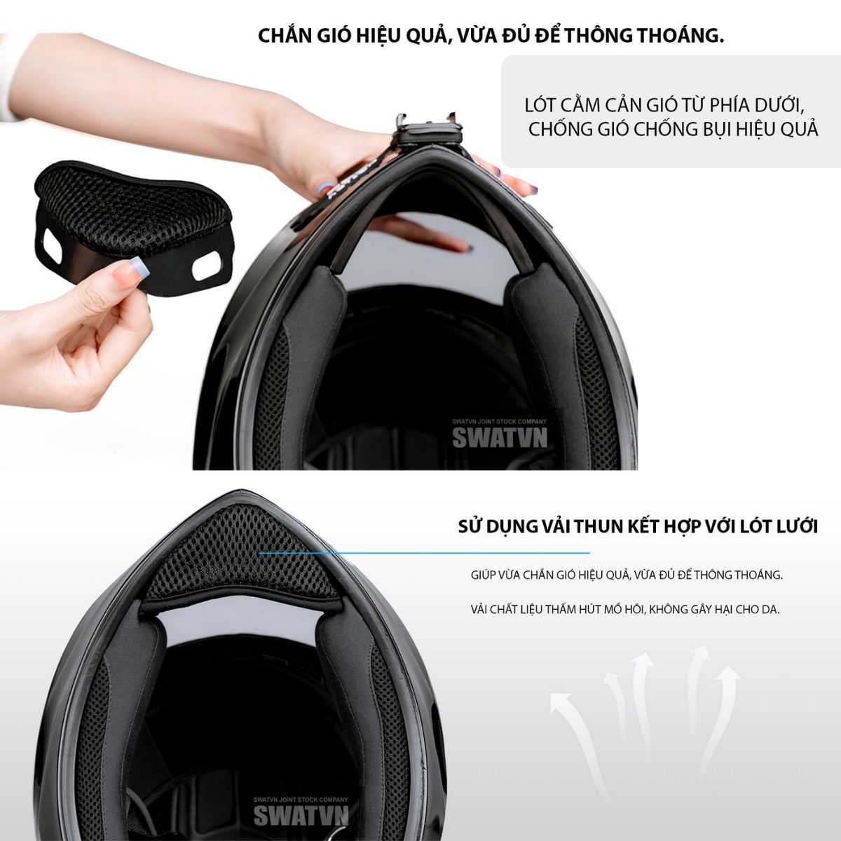 - Công dụng: Chống gió, chống bụi, giảm tiếng ồn, bảo vệ cằm
