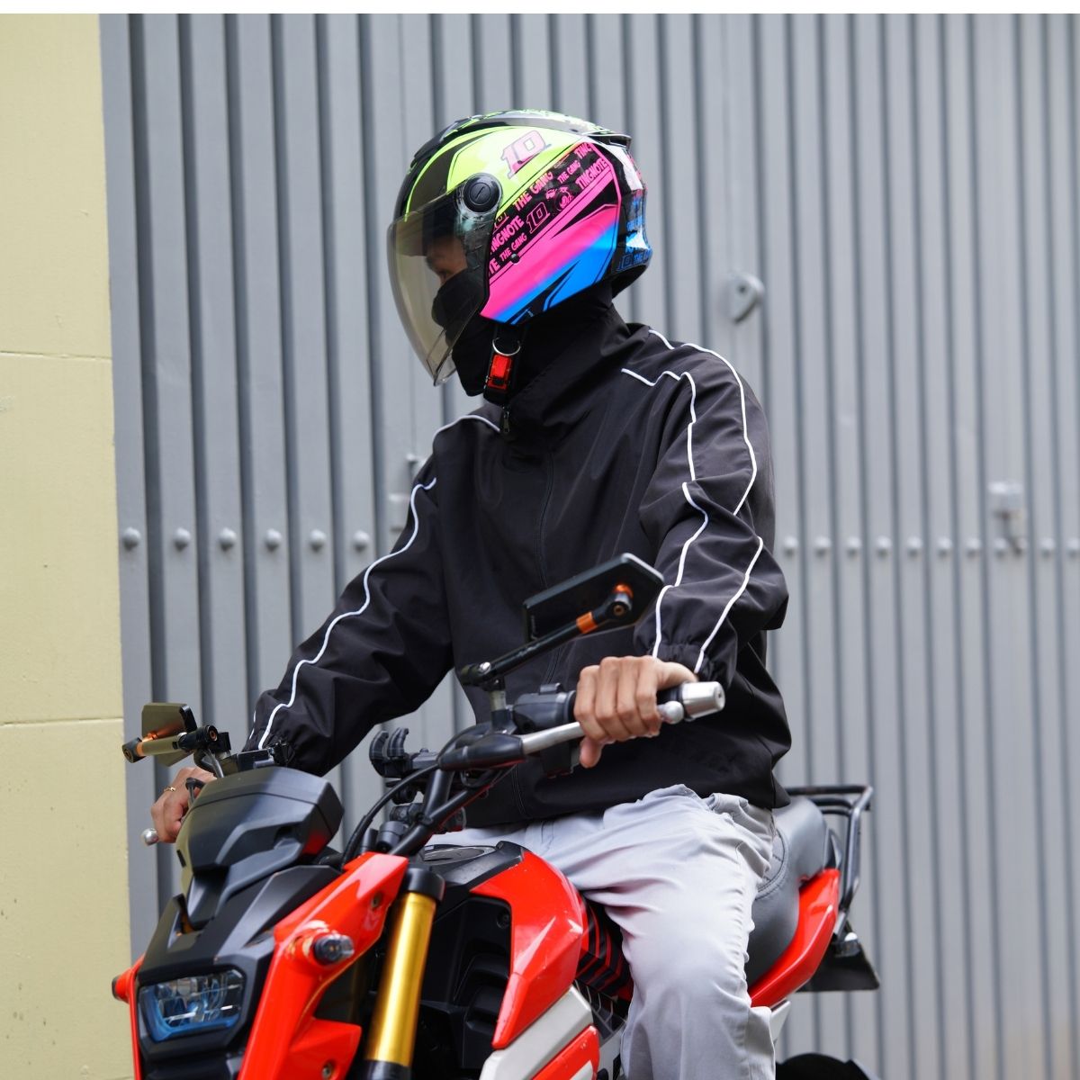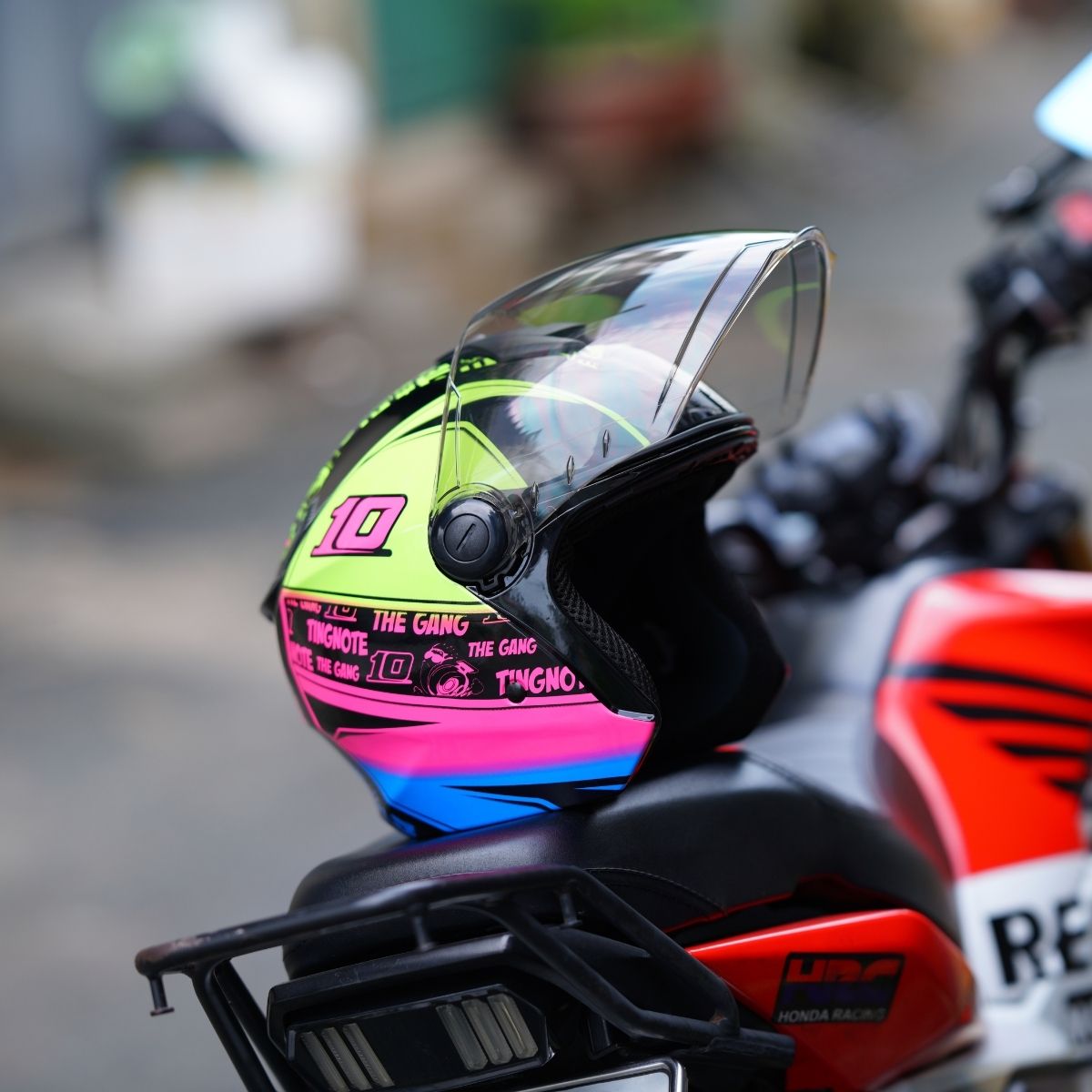 Royal XH01 tem Thitipong là phiên bản nổi bật nhất trong dòng mũ 3/4 đầu Royal. Lấy cảm hứng từ đường đua , mũ sở hữu màu vàng neon pha hồng – xanh dương độc đáo, vừa trẻ trung, vừa đậm phong cách tốc độ.