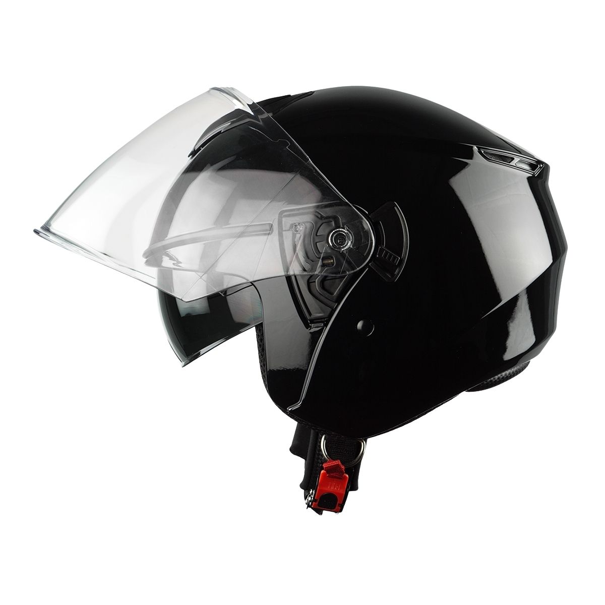 Mũ trang bị 2 kính độc lập: kính ngoài trong suốt chắn bụi – gió, kính trong tối chống chói nắng. Cần gạt bên hông thao tác dễ dàng, giúp người dùng chuyển đổi nhanh giữa hai chế độ khi di chuyển.