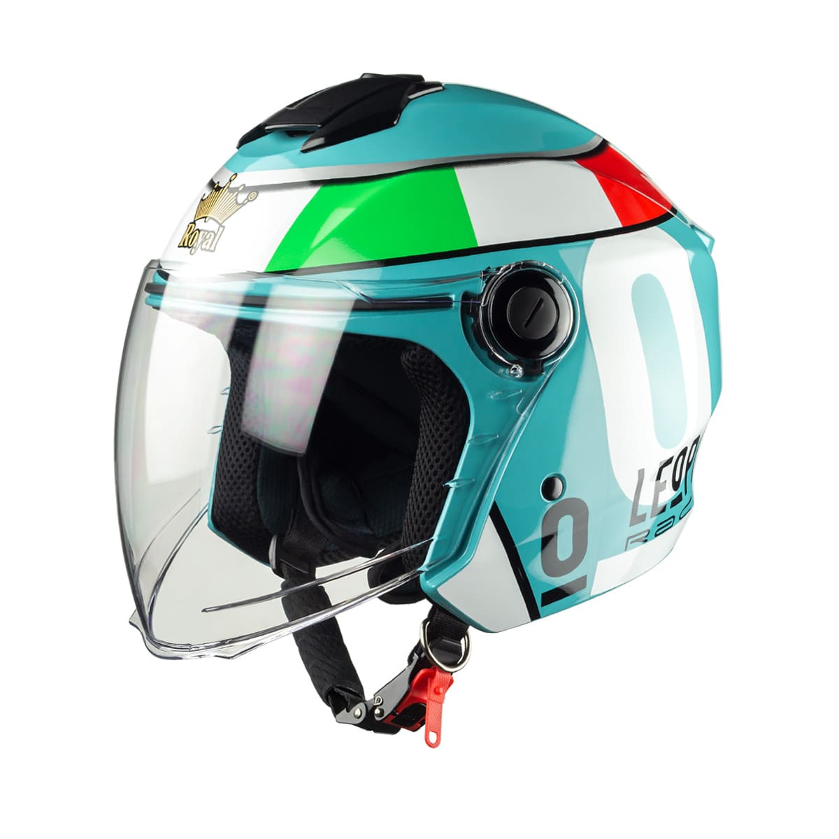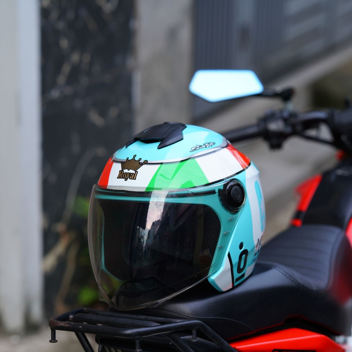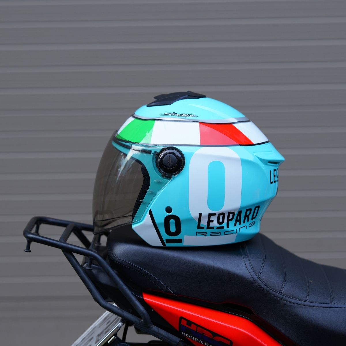 Royal XH01 Tem Leopard là phiên bản đặc biệt lấy cảm hứng từ đội đua Leopard Racing – nổi tiếng trong làng MotoGP. Tông màu xanh ngọc phối trắng, đỏ và đen cùng logo Leopard in nổi bật, giúp người đội thể hiện cá tính mạnh mẽ, năng động, pha chút chất “đua xe chuyên nghiệp”.