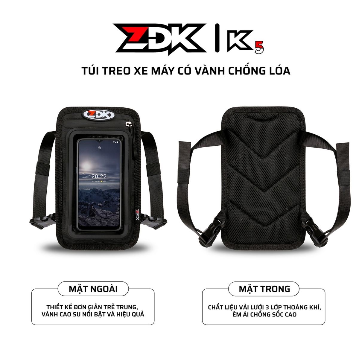 ZDK K5 là dòng túi treo đầu xe máy cao cấp, được thiết kế riêng cho nhu cầu sử dụng điện thoại an toàn khi di chuyển ngoài trời. Với vành cao su PVC chống lóa, túi giúp bạn dễ dàng quan sát màn hình dù đi dưới nắng gắt.